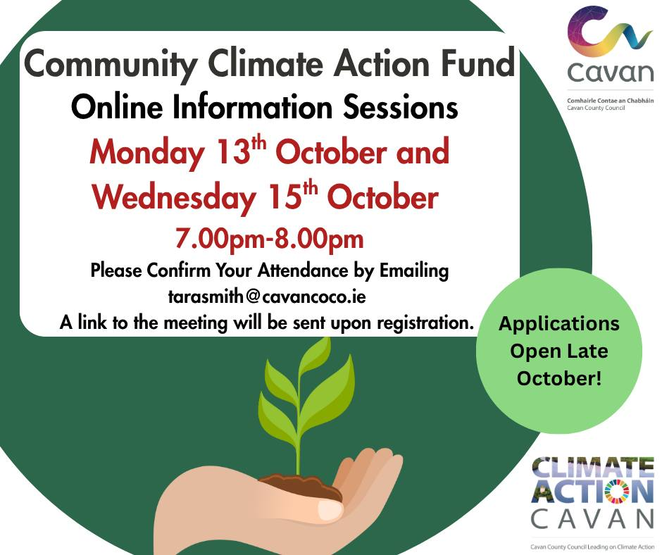 As part of a series of events to mark Climate Action Week 2025 in Cavan, not-for-profit community groups are invited to attend one of our online information sessions on either Monday 13th October or Wednesday 15th October from 7pm-8pm.
