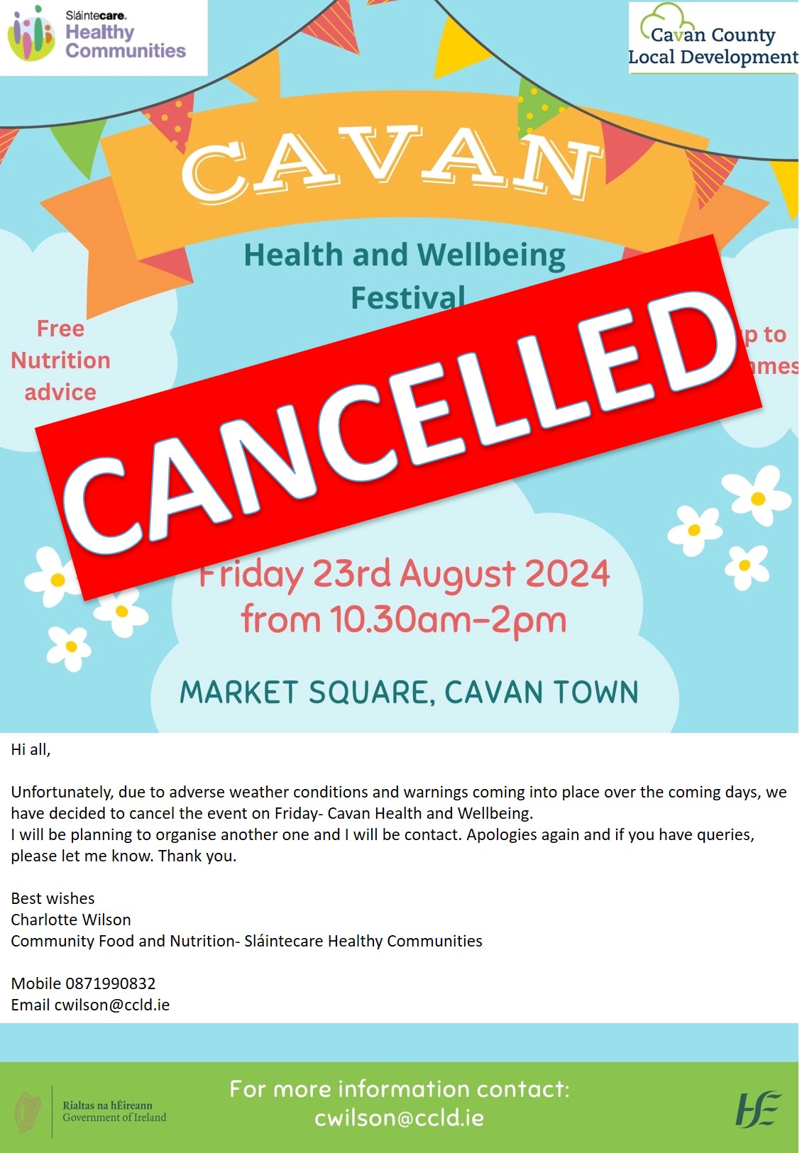 Cavan Health & Wellbeing Festival - August 23rd. Please note that this event has been CANCELLED due to forecasted adverse weather. Please click here for more information.